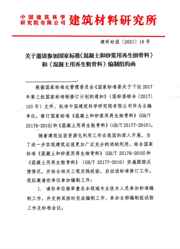 【邀请参编】关于邀请参与国家标准《混凝土和砂浆用再生细骨料》《混凝土用再生粗骨料》的函