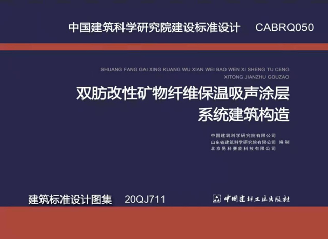 根据相关要求,由中国建筑科学研究院有限公司、山东省建筑科学研究院有限公司、北京易科赛能科技有限公司联合编制的《双肪改性矿物纤维保温吸声涂层系统建筑构造》图集,经中国建筑科学研究院有限公司建筑材料研究所组织专家会审,现予以发布,图集编号为20QJ711,自2020年12月1日起施行,并组织中国建材工业出版社出版发行(统一书号: 155160-2272,2020年12月第1版第1次印刷) 。